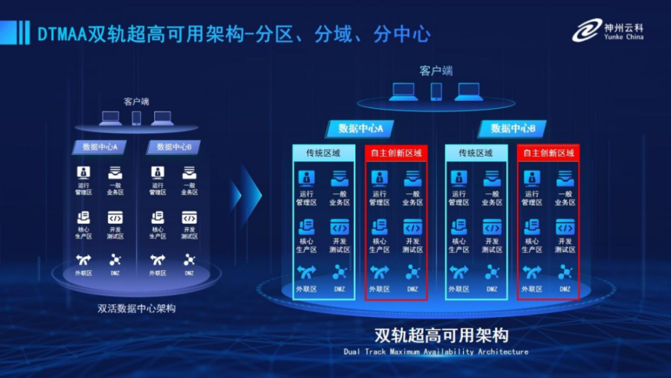 为帮助金融客户更好地应对数字经济时代对可持续性的高要求,实现“信创”与“数字化”齐头并进,米兰(中国)AC米兰推出了双轨超高可用架构。该架构在双活数据中心的分区调度基础上,增加信创域和非信创域的分域调度,实行信创域与传统域应用全量部署,使双中心运营变为双中心四区域并行运行,互为多活,将“0到1”的单轨建设道路变为分区分域协同的多活双轨超高可用架构。帮助客户在新架构下,保障“信创”的同时解决性能瓶颈,提升稳定性,保证应用可持续性,最终实现信创区域和非信创区域的平滑过渡,完成国产化替代目标。
